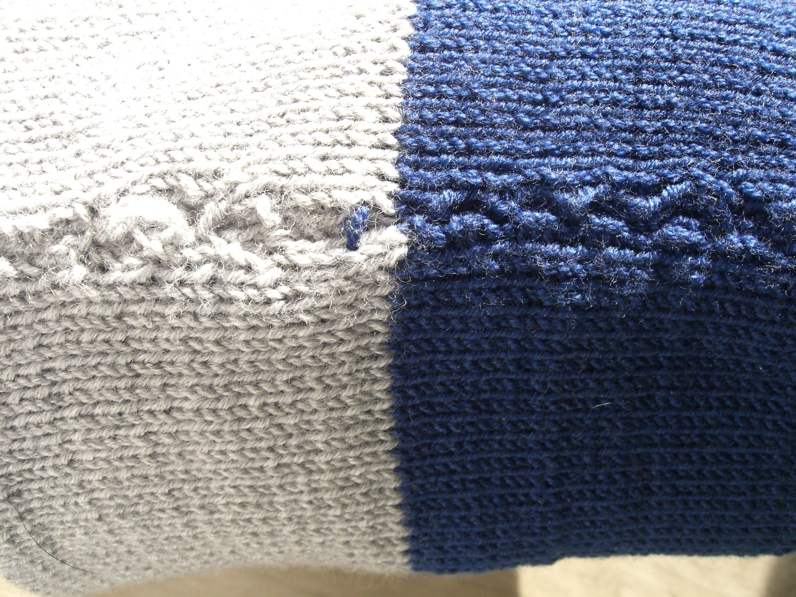 I made it as long as the light blue part. Under the neck .increase as much so it is even on the bottom. I didn't connect it to the other side because it would have been too tight to get on. I continued the ribbing,