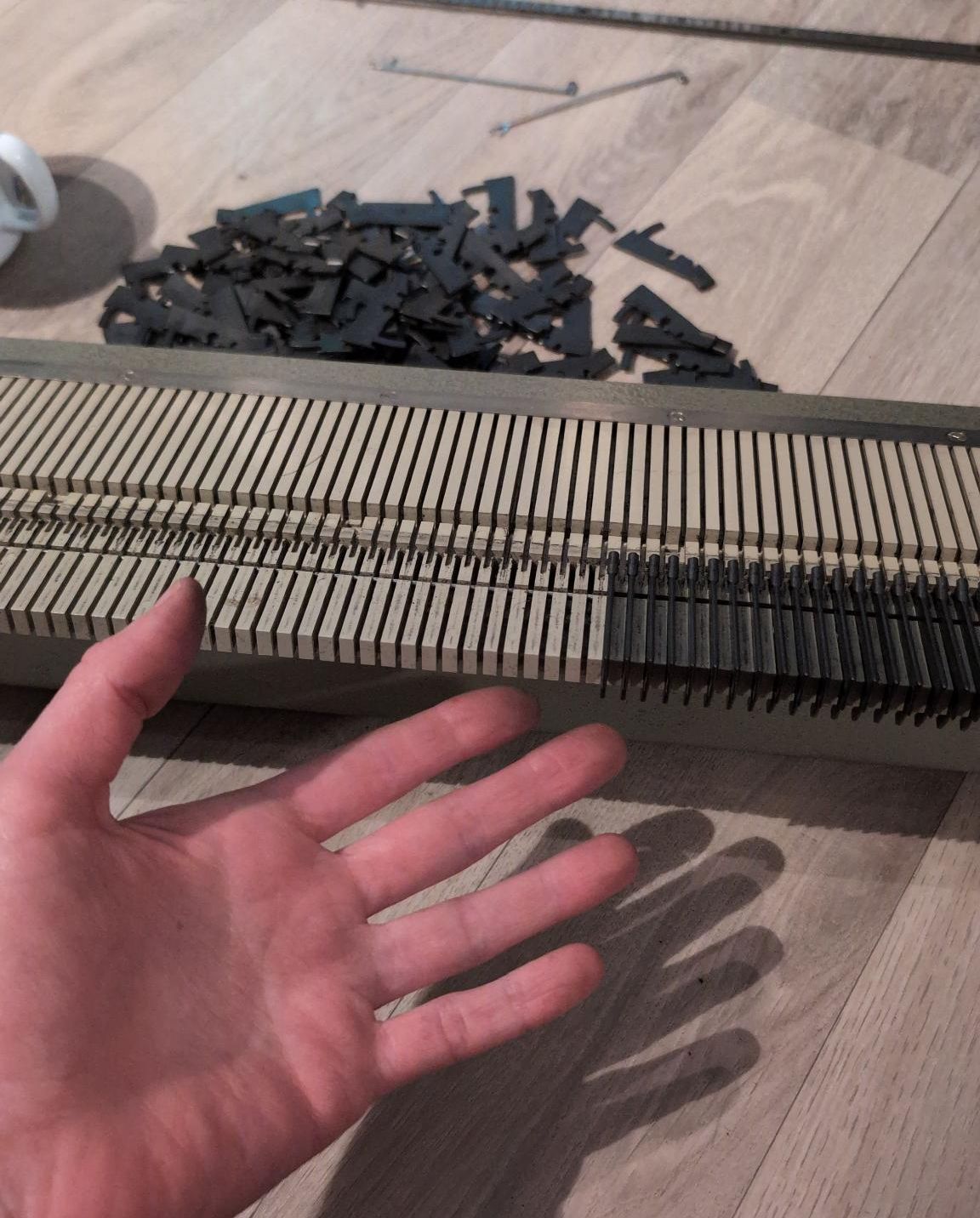 It is a 4,5mm standard gauge machine, it could have a ribber attachment but that wasn't included. The construction and mechanics of this machine are very similar to the more popular Knittax M2. However it has a similar yarn feeding and holding attachment as the AM (automatic) models. I don't have all parts for that but i can't imagine it working well, because for a consistent fabric you need consistent tension on the yarn, so I have been laying the yarn manually onto the needles. It is easier this way and have no more dropped stitches.