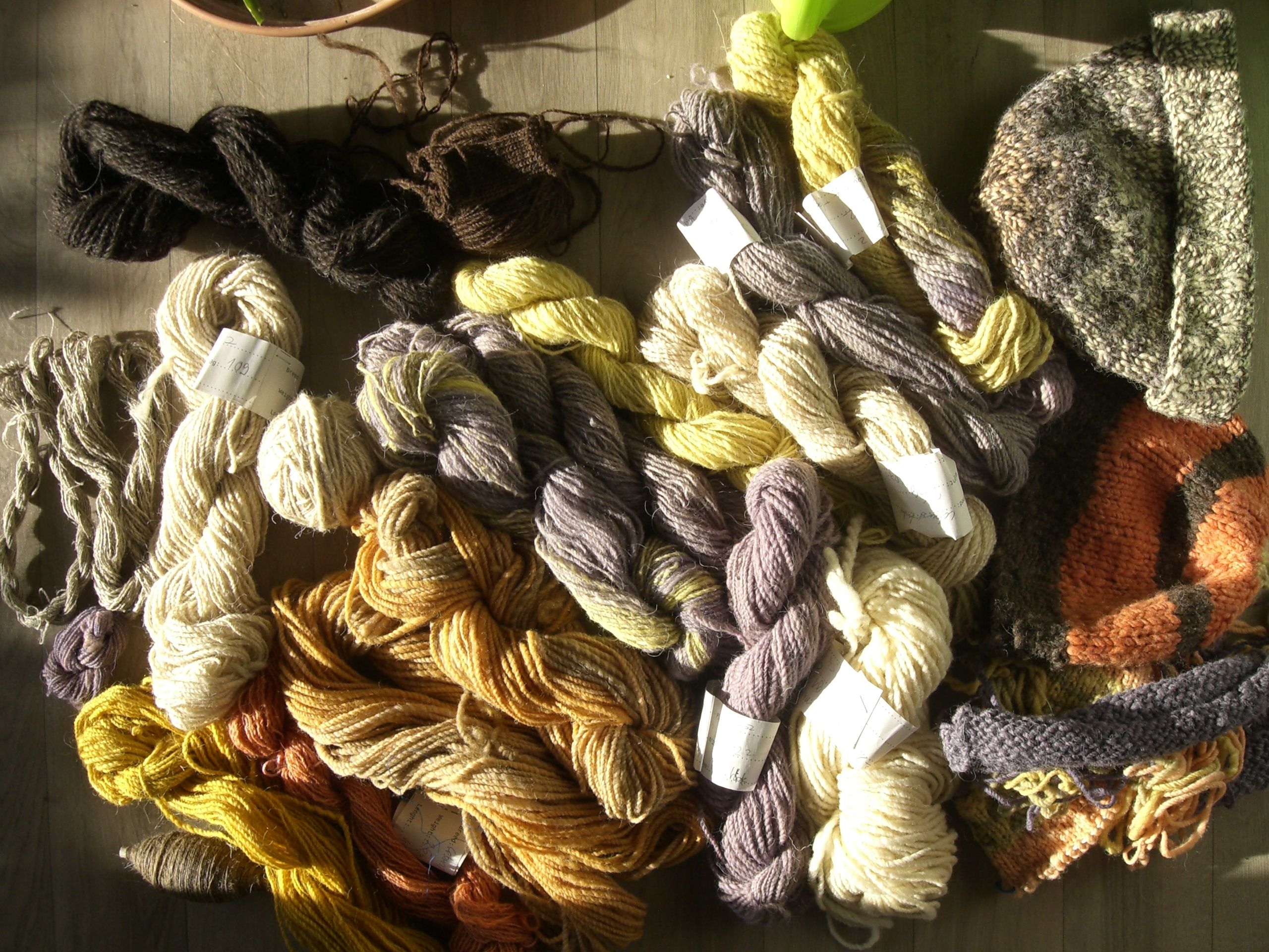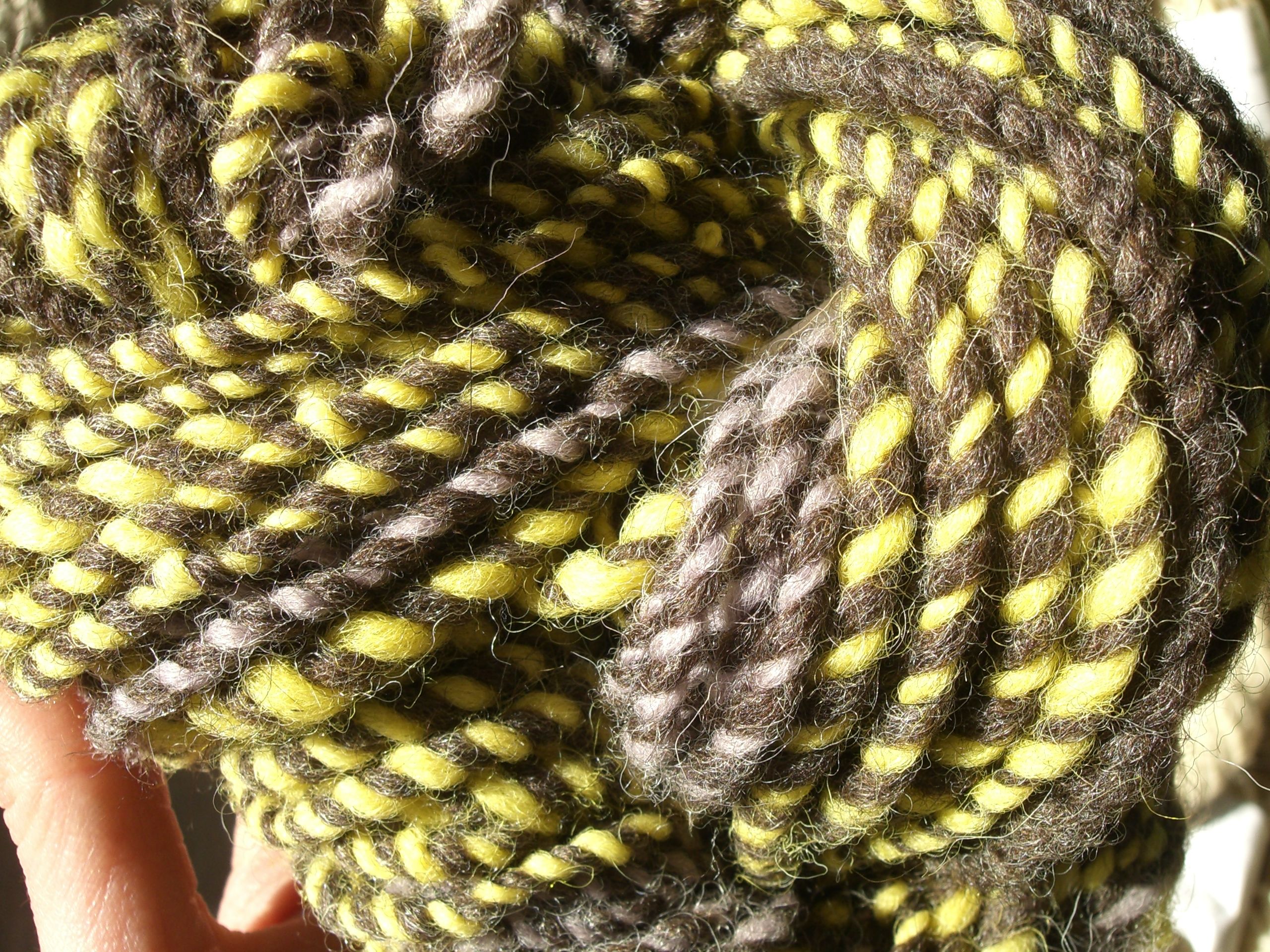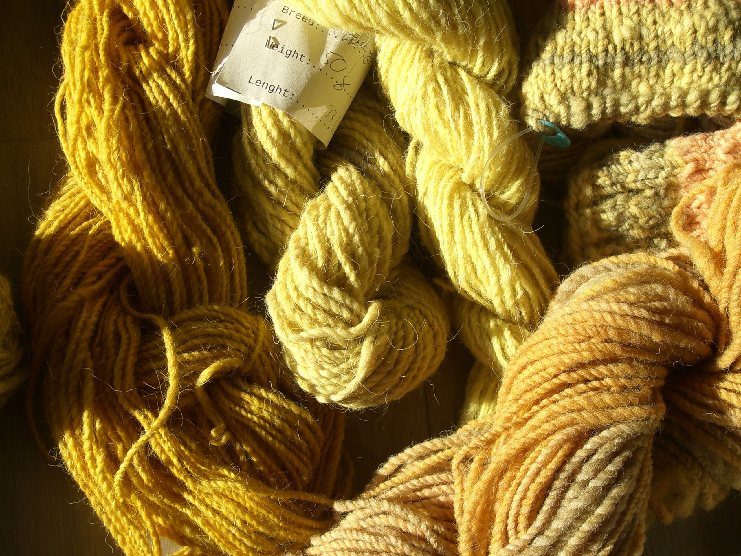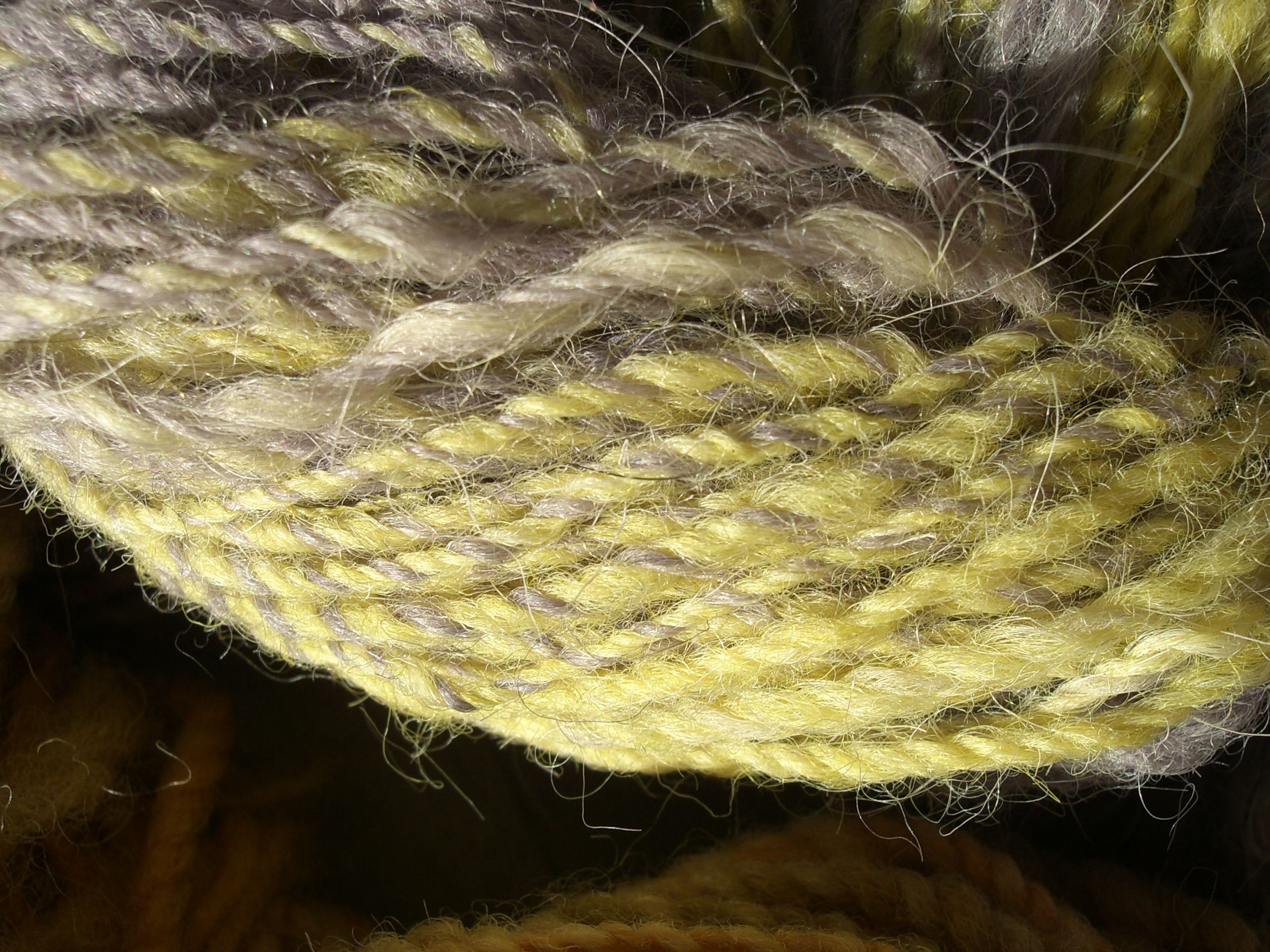 3 ply sock yarn, Cheviot and Devon, dyed with goldenrod and log wood.